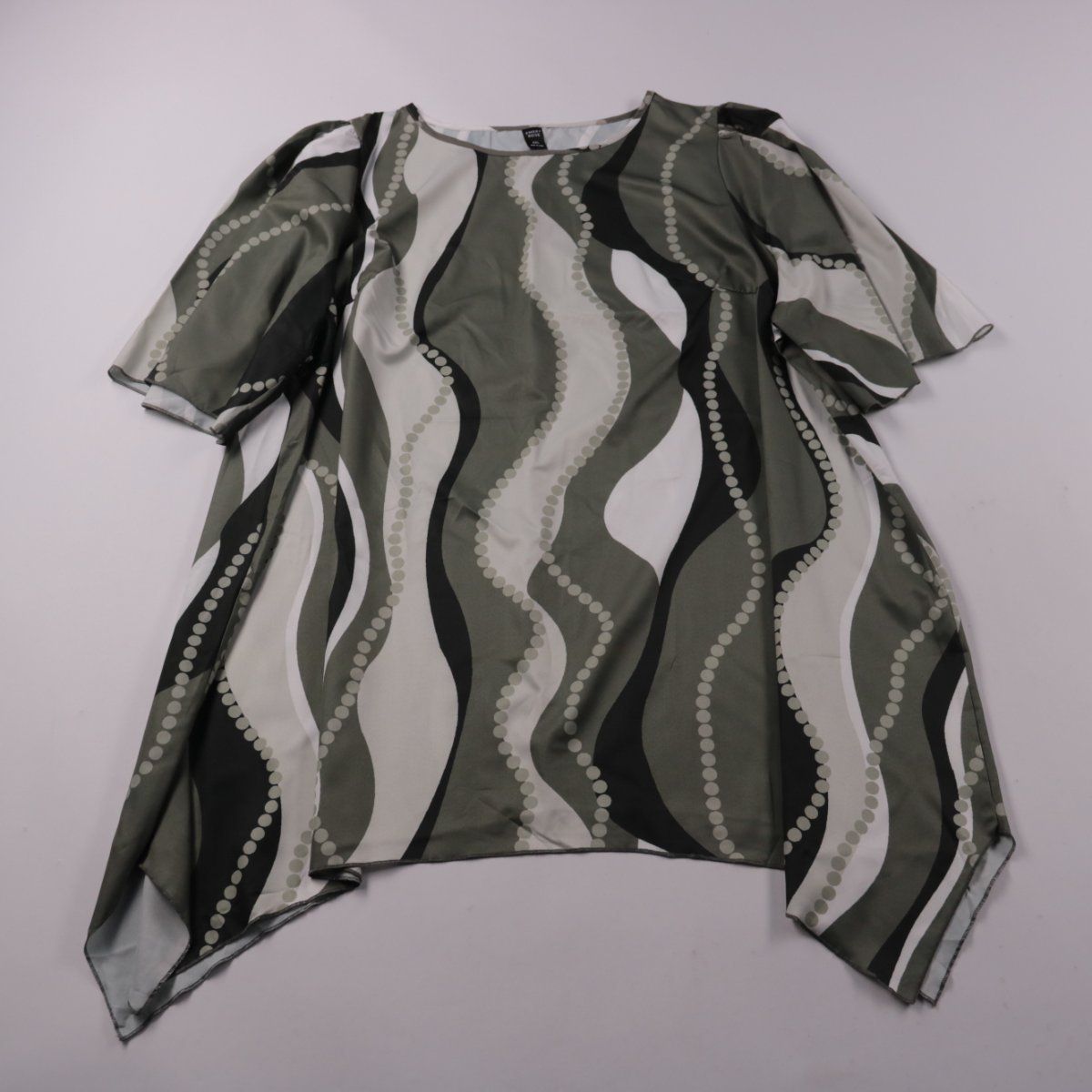 Блузка Emery Rose из лёгкой полупрозрачной ткани с абстрактным волнистым принтом в хаки, белом и чёрном цветах. Свободный оверсайз-крой с коротким рукавом и асимметричным низом подойдёт для повседневных летних образов и отдыха. Практичное преимущество — материал почти не мнётся и быстро сохнет.