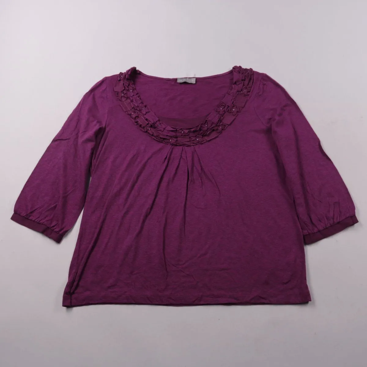 Блузка Per Una фиолетового цвета из мягкого трикотажа с декоративной отделкой по вырезу и защипами спереди. Подойдёт для повседневных образов и офиса с кардиганом или жакетом. Комфортна в носке и почти не сковывает движения за счёт эластичной ткани.