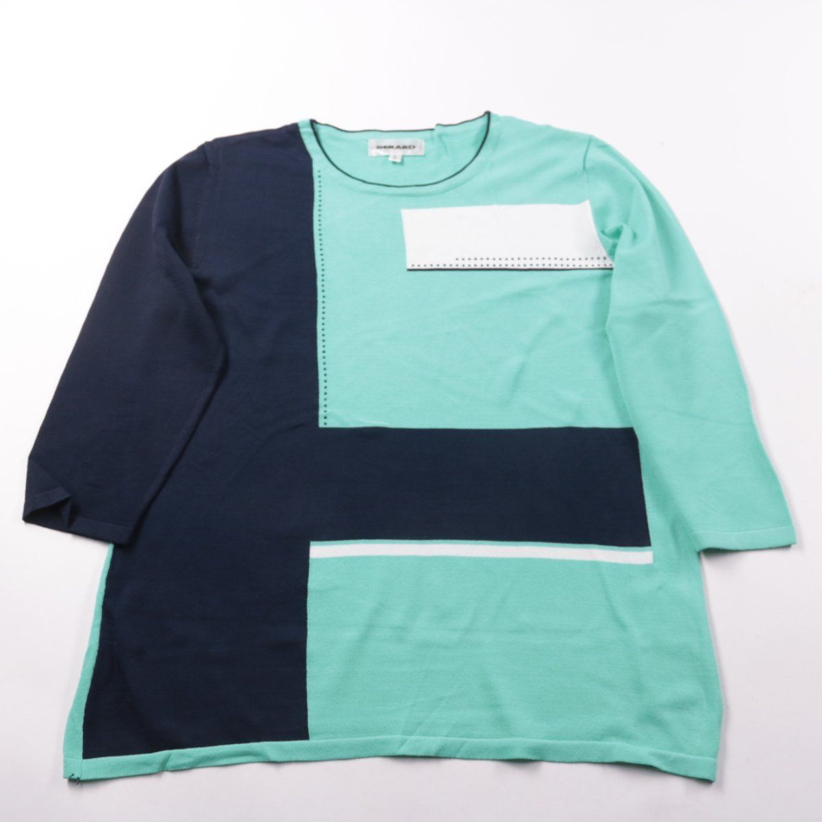 Женская блузка Gerard прямого кроя с круглым вырезом и длинным рукавом. Модель в контрастном колор-блок дизайне (мятный и тёмно-синий) подойдёт для повседневных образов и офиса без строгого дресс-кода. Вискозная ткань приятна к телу и хорошо драпируется.