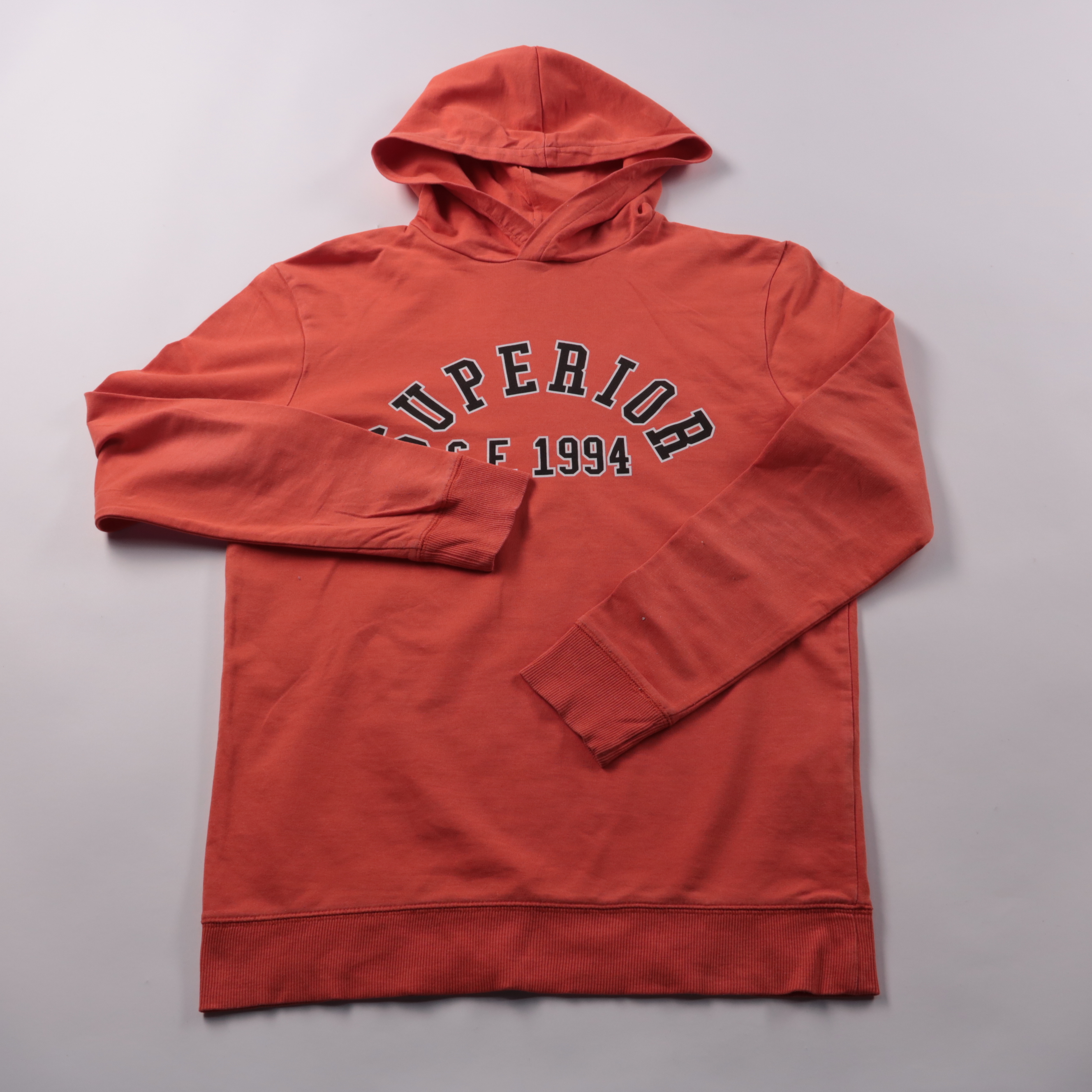 Худи H&M кирпично-красного цвета с капюшоном и принтом Superior 1994. Подойдёт для повседневных образов, прогулок и учёбы в прохладную погоду. Мягкий хлопковый футер с добавлением полиэстера хорошо держит форму и проще в уходе.