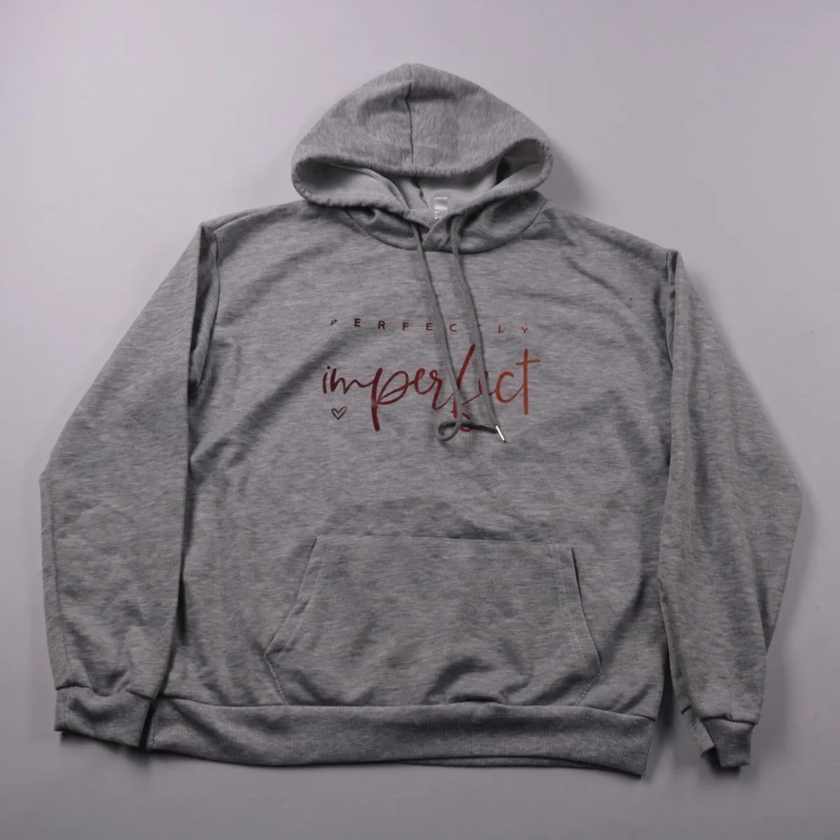 Серое худи с капюшоном и карманом-кенгуру, спереди принт «Perfectly imperfect». Подойдёт для повседневной носки и прогулок в прохладную погоду. Мягкий трикотаж и капюшон защищают от ветра и добавляют комфорта.