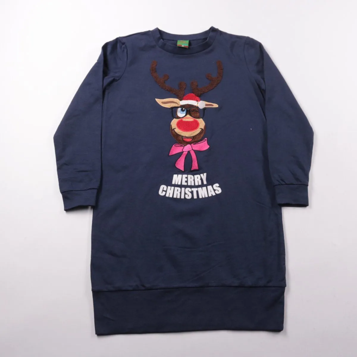 Свитшот Merry Christmas тёмно-синего цвета с новогодним принтом оленя и надписью. Подойдёт для зимних праздников, прогулок и домашнего отдыха. Практичен тем, что хлопковая ткань приятна к телу и проста в уходе.
