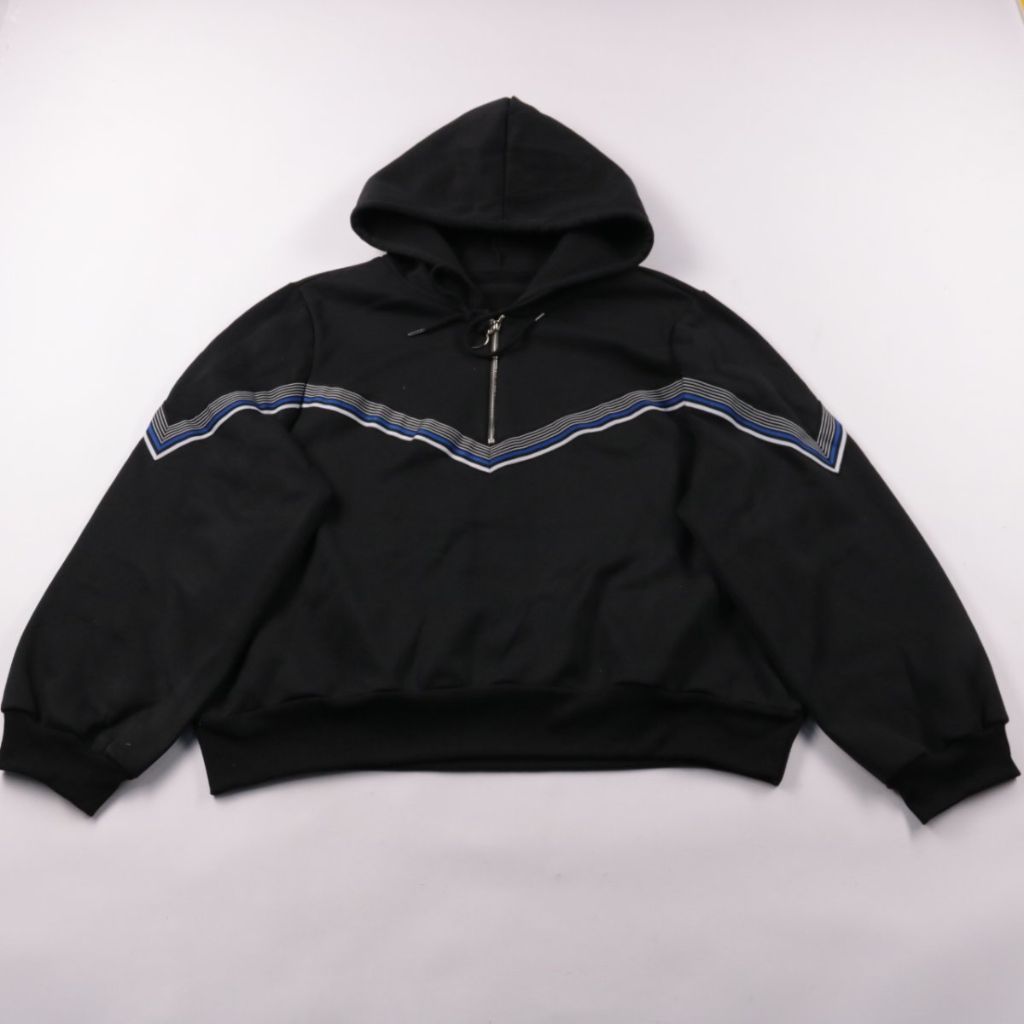 Чёрное худи с короткой молнией у горловины и капюшоном, декорировано V-образной полосой в сине-серых тонах на груди и рукавах. Подойдёт для повседневной носки в прохладную погоду и для прогулок. Внутренняя сторона с мягким начёсом, удобно сохраняет тепло.