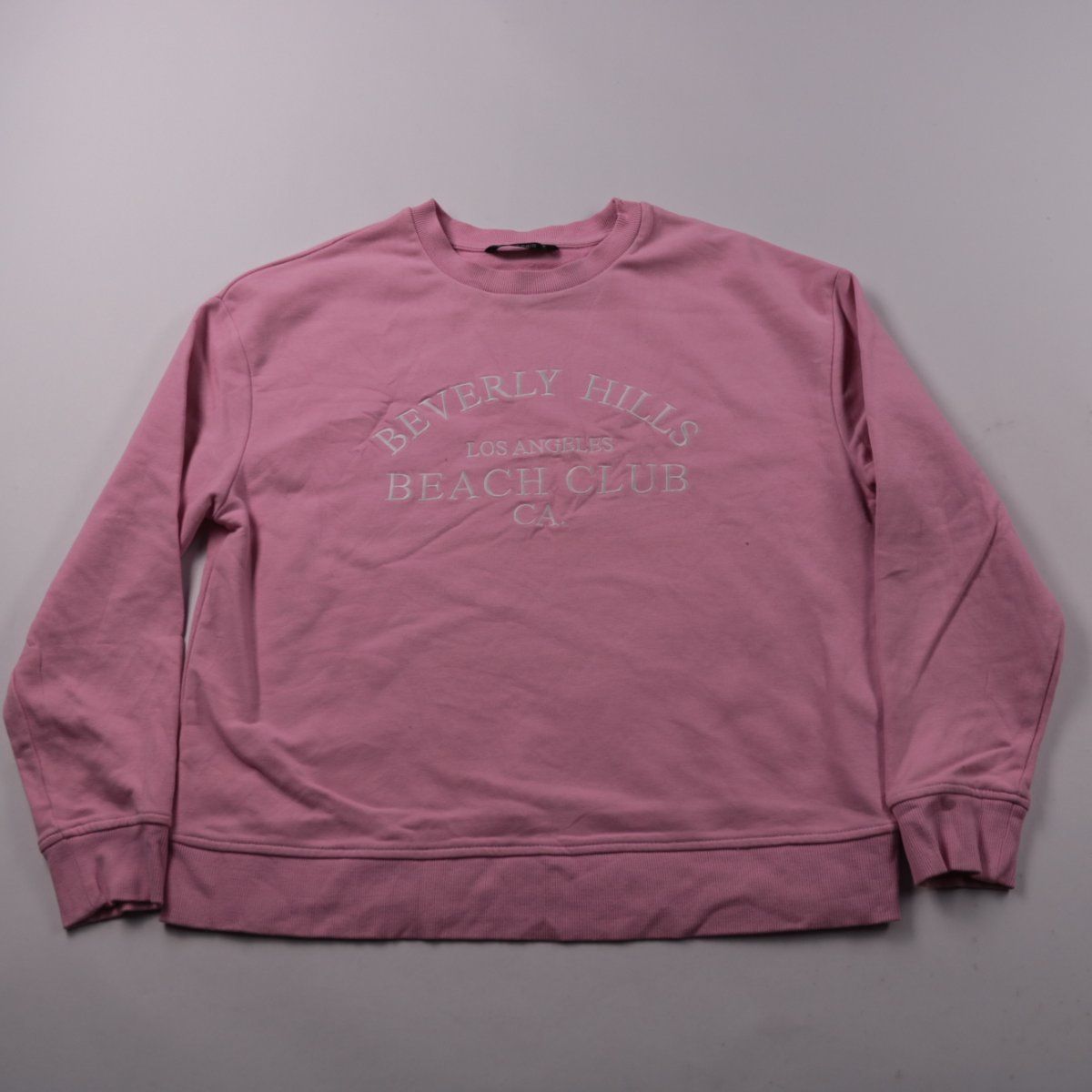 Розовый свитшот Dunnes с круглым вырезом и принтом «Beverly Hills Beach Club» на груди. Подойдёт для повседневных образов и прогулок в прохладную погоду, хорошо сочетается с джинсами и спортивными брюками. Практичный плюс — мягкий футер и манжеты по низу и рукавам держат форму.