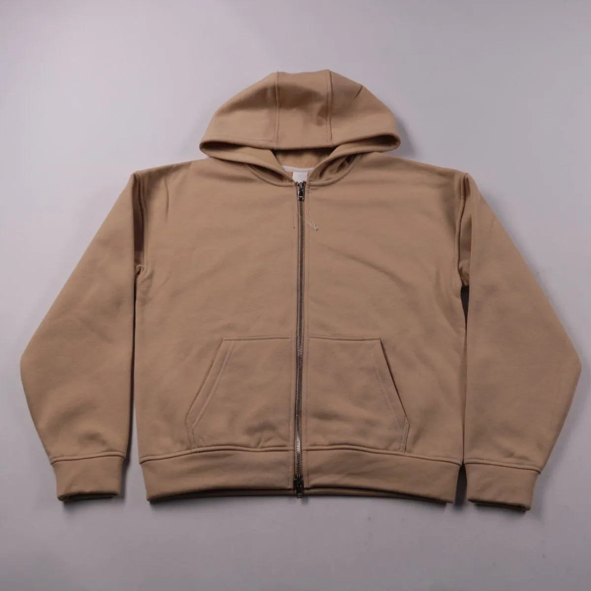 Толстовка на молнии с капюшоном без указания бренда, выполнена в бежевом цвете и с карманами-кенгуру. Подойдёт для повседневной носки и многослойных образов в прохладную погоду. Мягкая ткань с изнанки делает её комфортной для длительной носки.