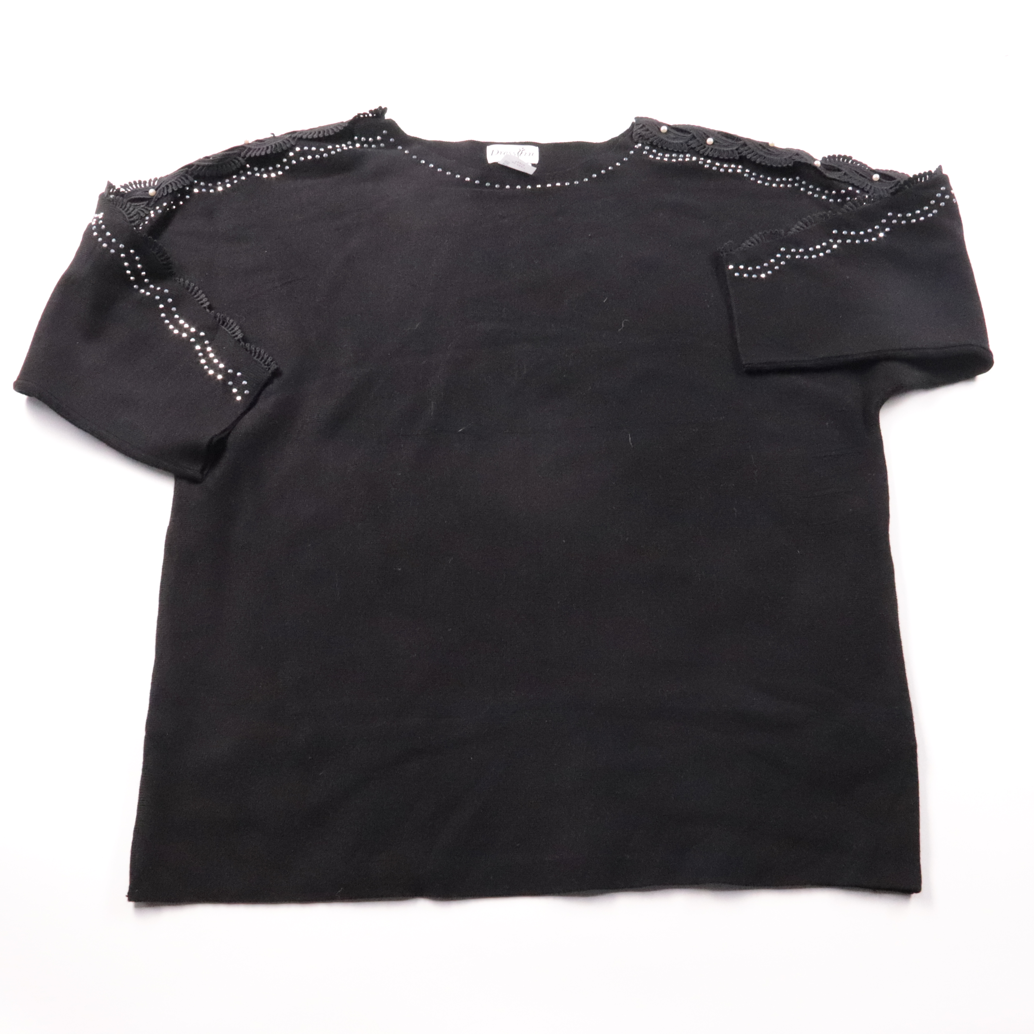 Футболка Dress In чёрного цвета с декоративной отделкой из кружева и мелких бусин по плечам. Подойдёт для повседневных образов и выхода, когда нужен аккуратный акцент без лишнего декора. Ткань на основе вискозы мягкая и приятная к телу, хорошо дышит.
