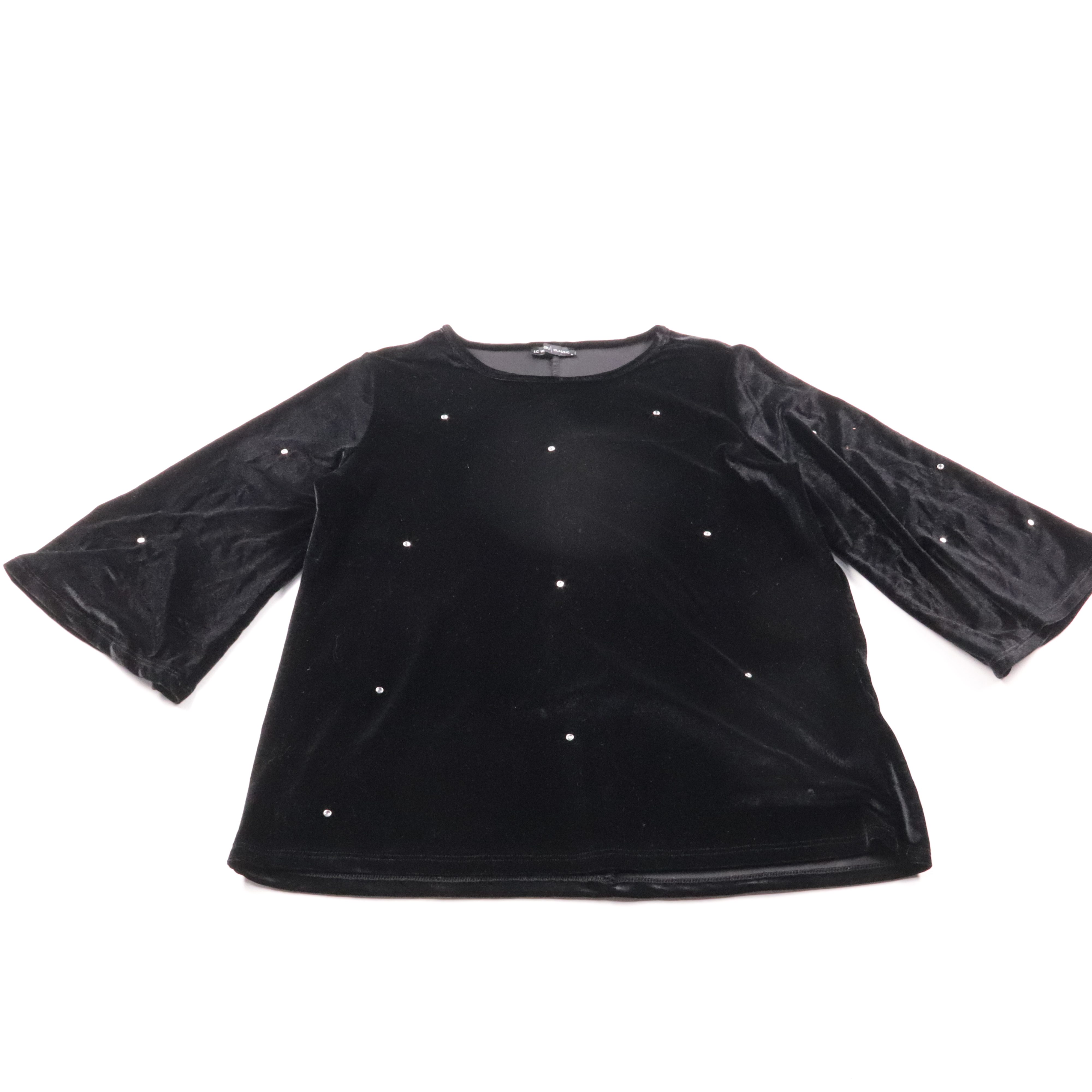 Черный велюровый лонгслив LC Waikiki Classic с декоративными стразами и рукавом 3/4. Подойдет для повседневных и вечерних образов с джинсами или юбкой. Мягкий эластичный материал комфортно сидит и не сковывает движения.