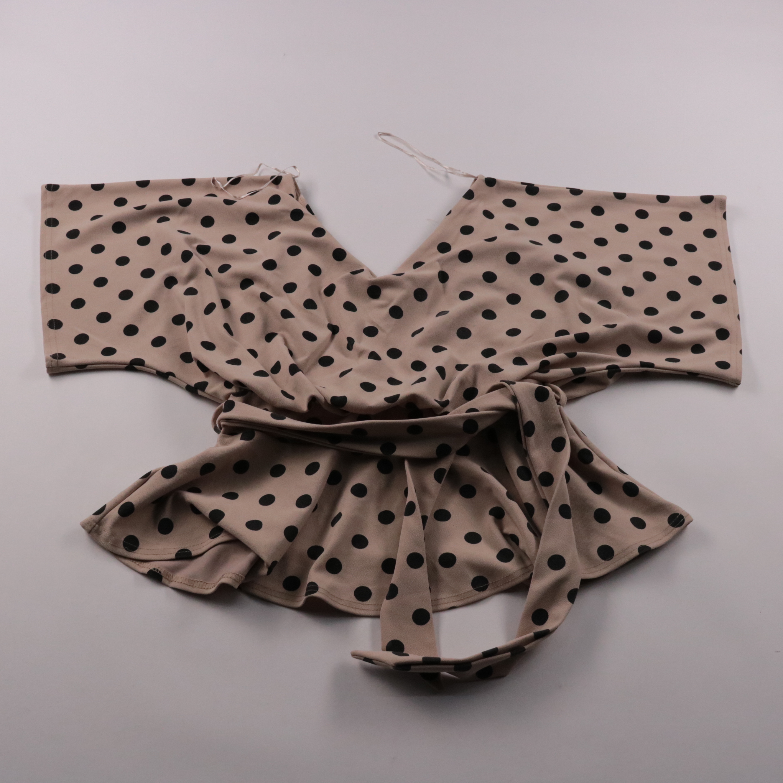 Женский топ Quiz бежевого цвета в чёрный горох, с V-образным вырезом и поясом на талии. Подойдёт для летних прогулок и выходов, легко сочетается с джинсами, брюками и юбками. Ткань с эластаном слегка тянется и комфортно садится по фигуре.