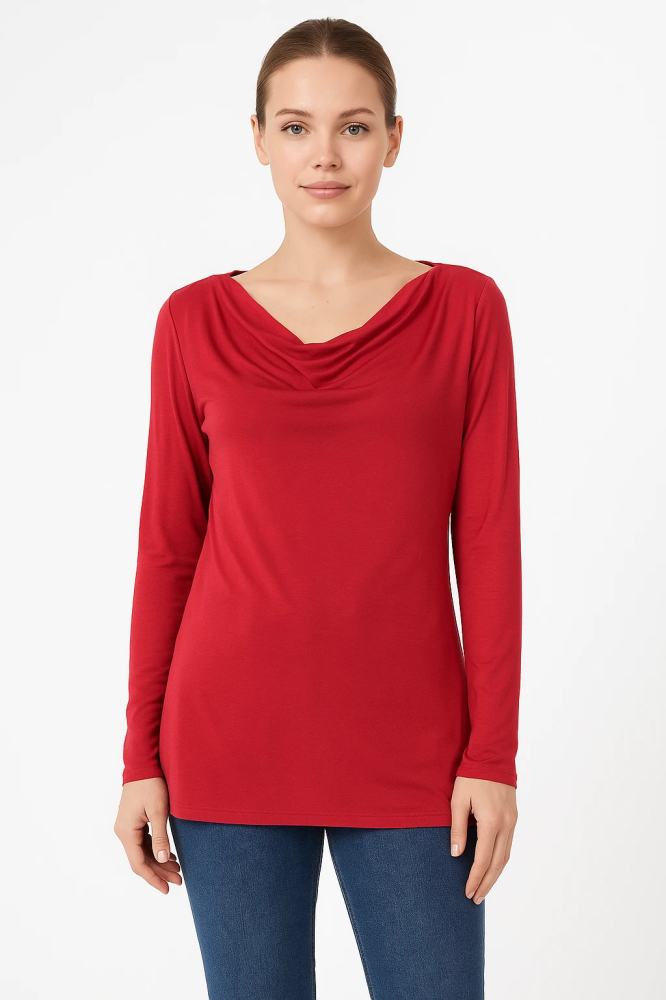 Лонгслив Damsel in a dress красного цвета из мягкой вискозы с добавлением эластана, хорошо тянется и комфортно сидит. Драпированный вырез делает образ аккуратным и подходит для офиса или повседневных выходов. Материал приятен к телу и не стесняет движе...
