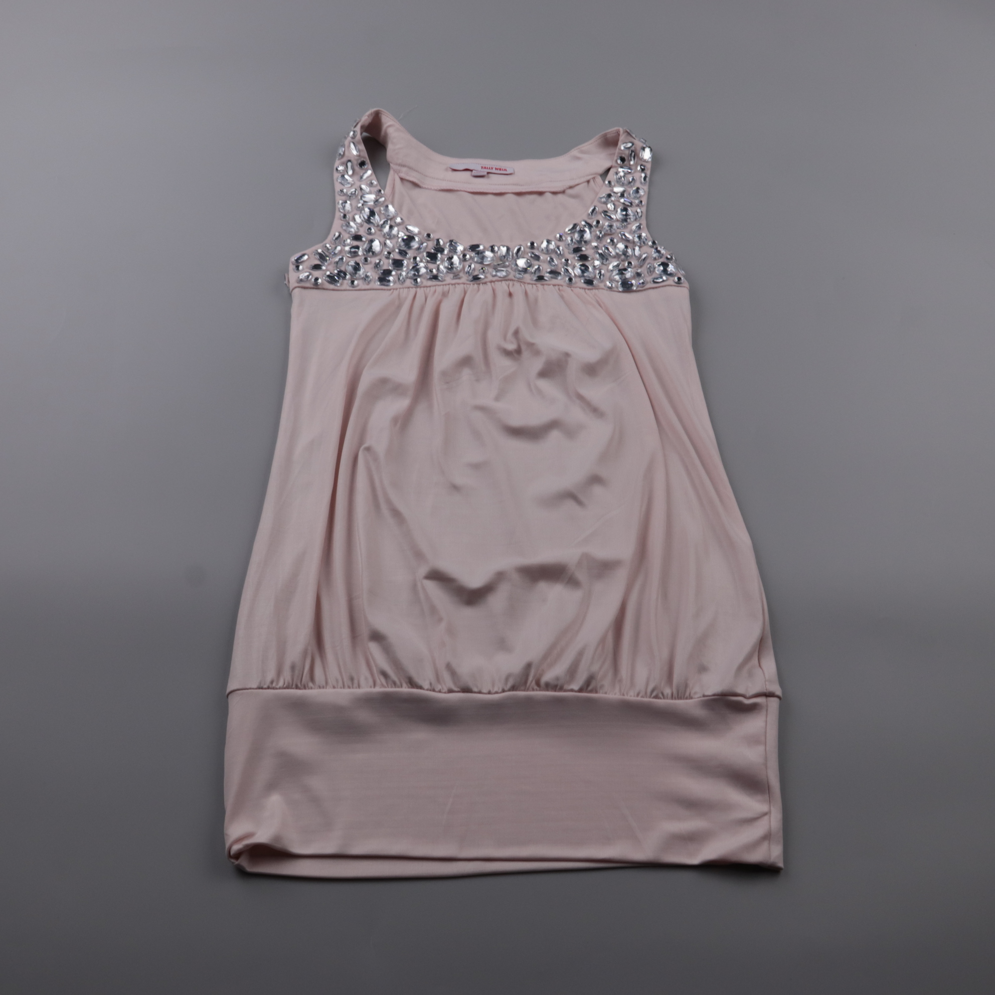 Топ Tally Weijl нежно-розового цвета с широкими бретелями и декоративными камнями по линии декольте. Подойдёт для вечерних выходов и летних образов, хорошо смотрится с юбкой или джинсами. Эластичная вставка по низу помогает комфортно сидеть по фигуре.