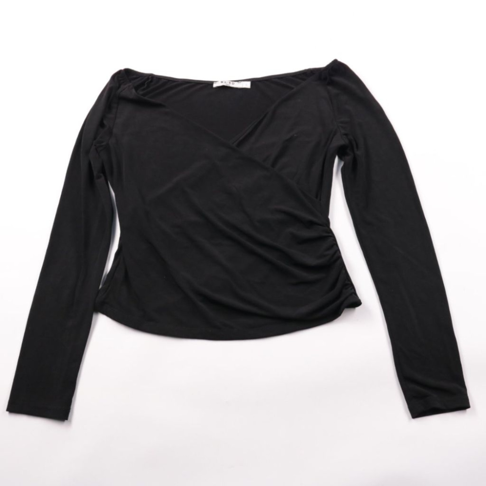 Чёрный лонгслив NA-KD с запахом и драпировкой по бокам, мягко подчёркивает силуэт. Подойдёт для повседневных образов и вечера, хорошо сочетается с джинсами или юбкой с высокой талией. Длинные рукава и эластичный материал делают посадку комфортной.