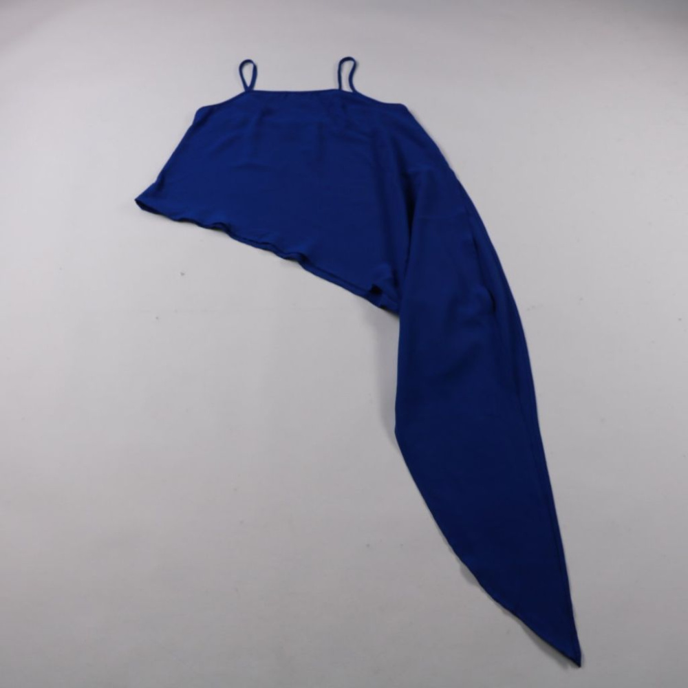 Синий топ на тонких бретелях с асимметричным кроем и удлинённым концом. Подойдёт для летних образов и вечеринок, хорошо смотрится с джинсами или юбкой с высокой посадкой. Лёгкая ткань почти не мнётся и быстро сохнет.