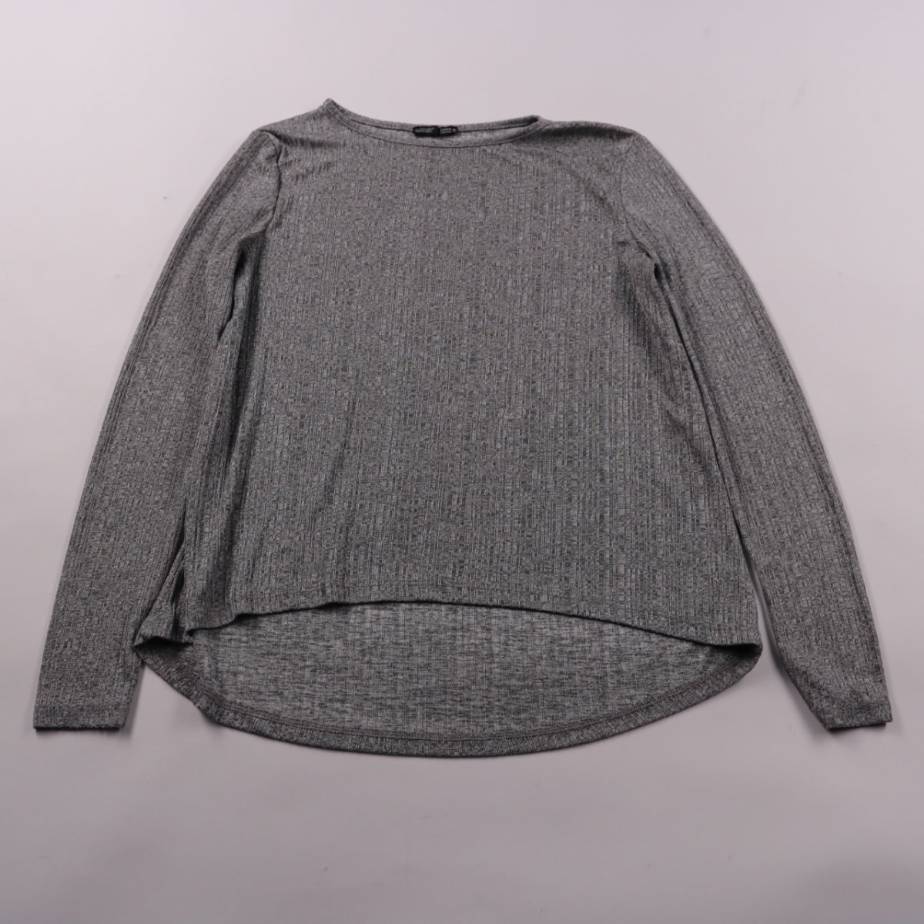 Серый лонгслив Zara из мягкого трикотажа в рубчик, с округлым вырезом и удлинённой спинкой. Подойдёт для повседневных образов и как базовый слой в прохладную погоду. Тянется и комфортно садится по фигуре, не сковывая движения.