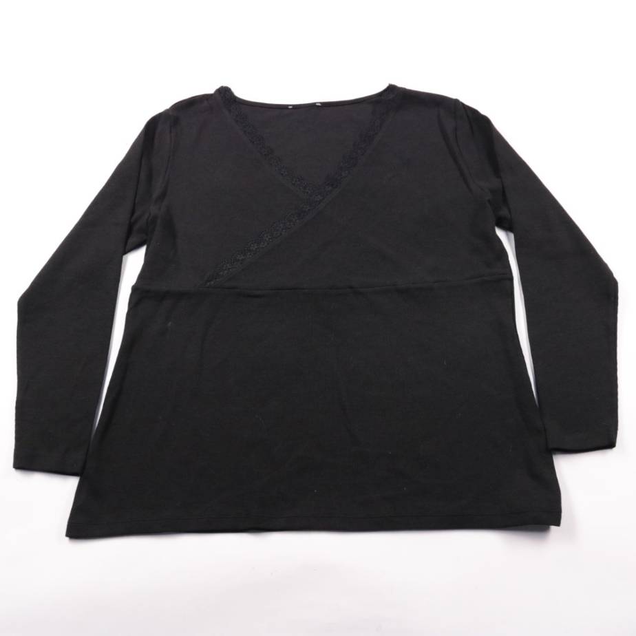 Женский чёрный лонгслив с запахом и V-образным вырезом, отделанным кружевной тесьмой. Подойдёт для повседневных образов и в офис под жакет. Практичный плюс — эластичный трикотаж комфортно садится по фигуре.