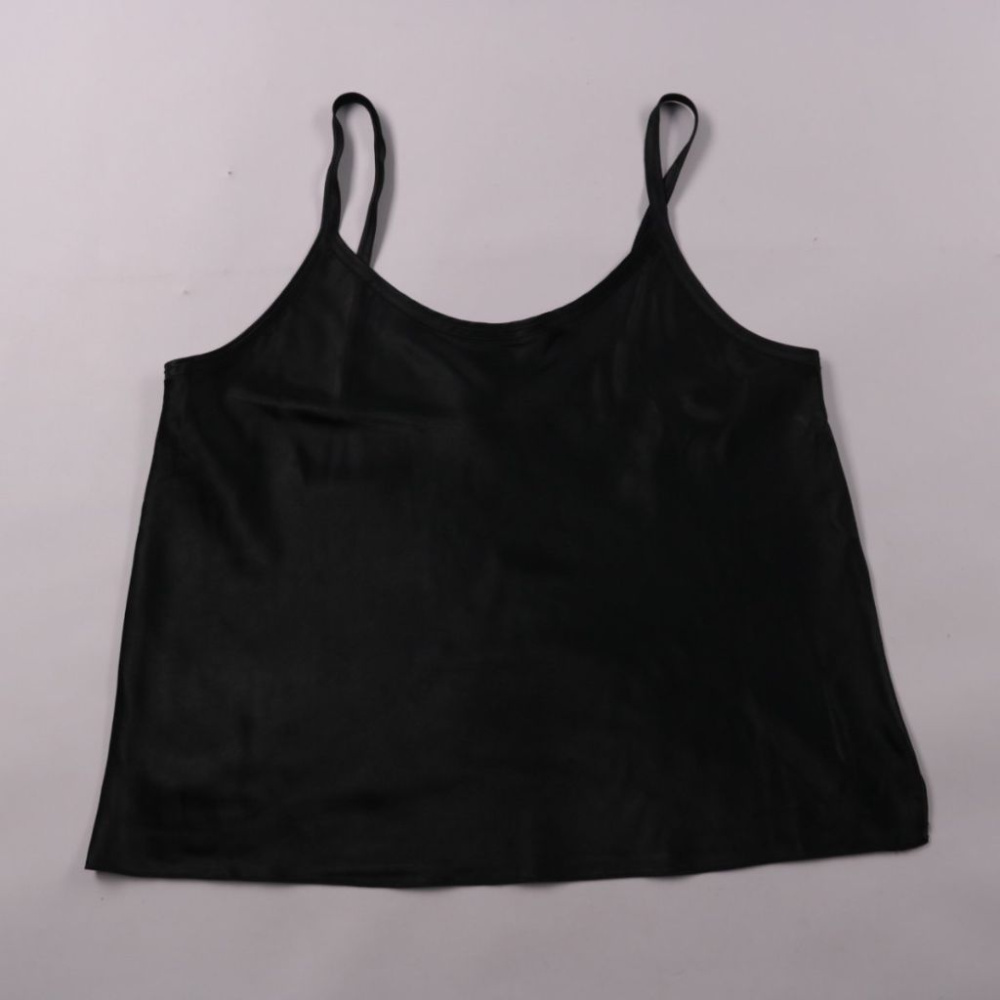 Чёрный топ на тонких бретелях, гладкая ткань с лёгким блеском. Подойдёт для базовых повседневных образов и как нижний слой под жакет или кардиган. Лёгкий и компактный, удобно брать с собой и быстро сохнет после стирки.