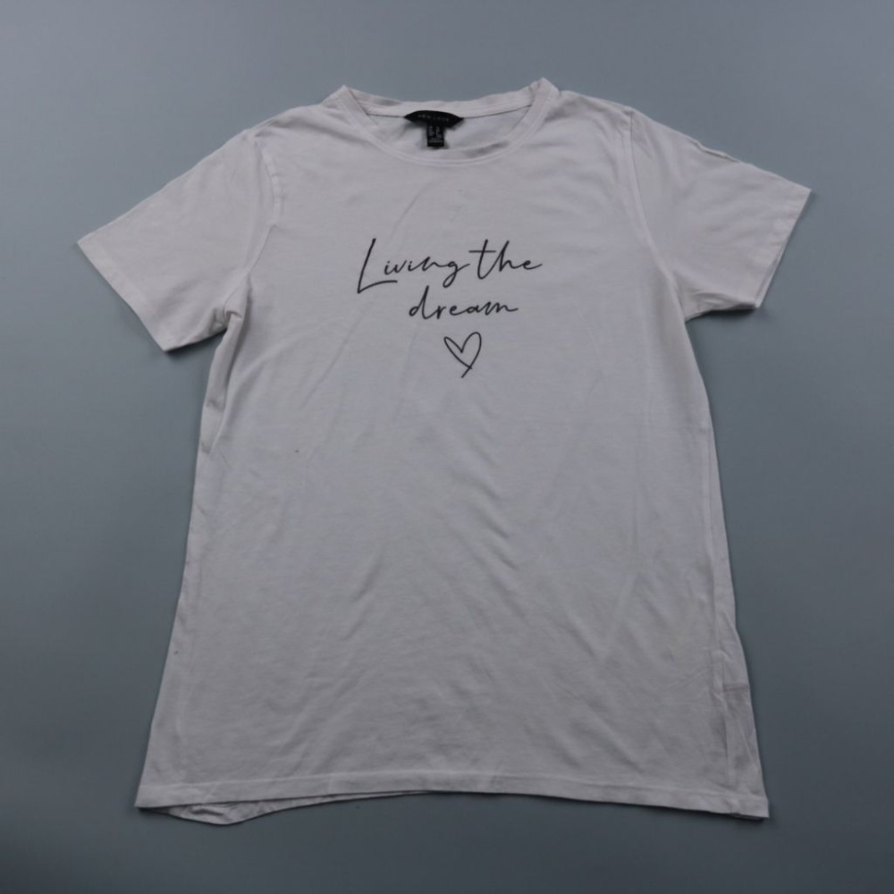 Белая футболка New Look с лаконичным принтом «Living the dream» и сердечком. Подойдёт для повседневных образов, дома и прогулок в тёплую погоду или как базовый слой под жакет/кардиган. Хлопковая ткань хорошо дышит и проста в уходе.