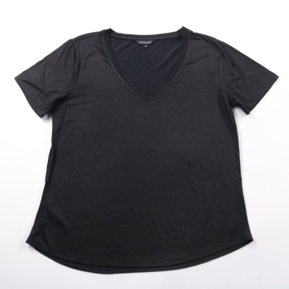 Женская чёрная футболка Peacocks с V-образным вырезом и коротким рукавом. Подойдёт для повседневных образов и как базовый слой под жакет или кардиган. Практичный цвет и лаконичный крой легко сочетаются с джинсами и юбками.