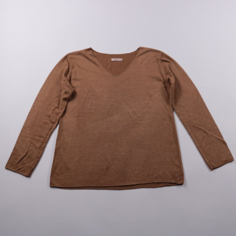Женский лонгслив коричневого цвета с V-образным вырезом и небольшим декором на бирке. Подойдёт для повседневных образов и как базовый слой под жакет или кардиган. Практичный вариант: легко сочетать с джинсами и брюками.