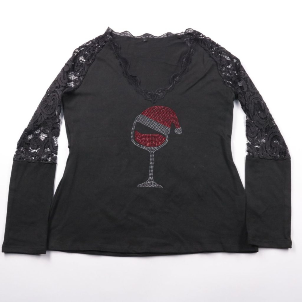 Женский чёрный лонгслив с кружевными рукавами и V-образным вырезом, спереди декор со стразами (бокал/шапка). Подойдёт для вечерних выходов и на каждый день с джинсами или юбкой. Материал тянется и комфортно садится по фигуре.