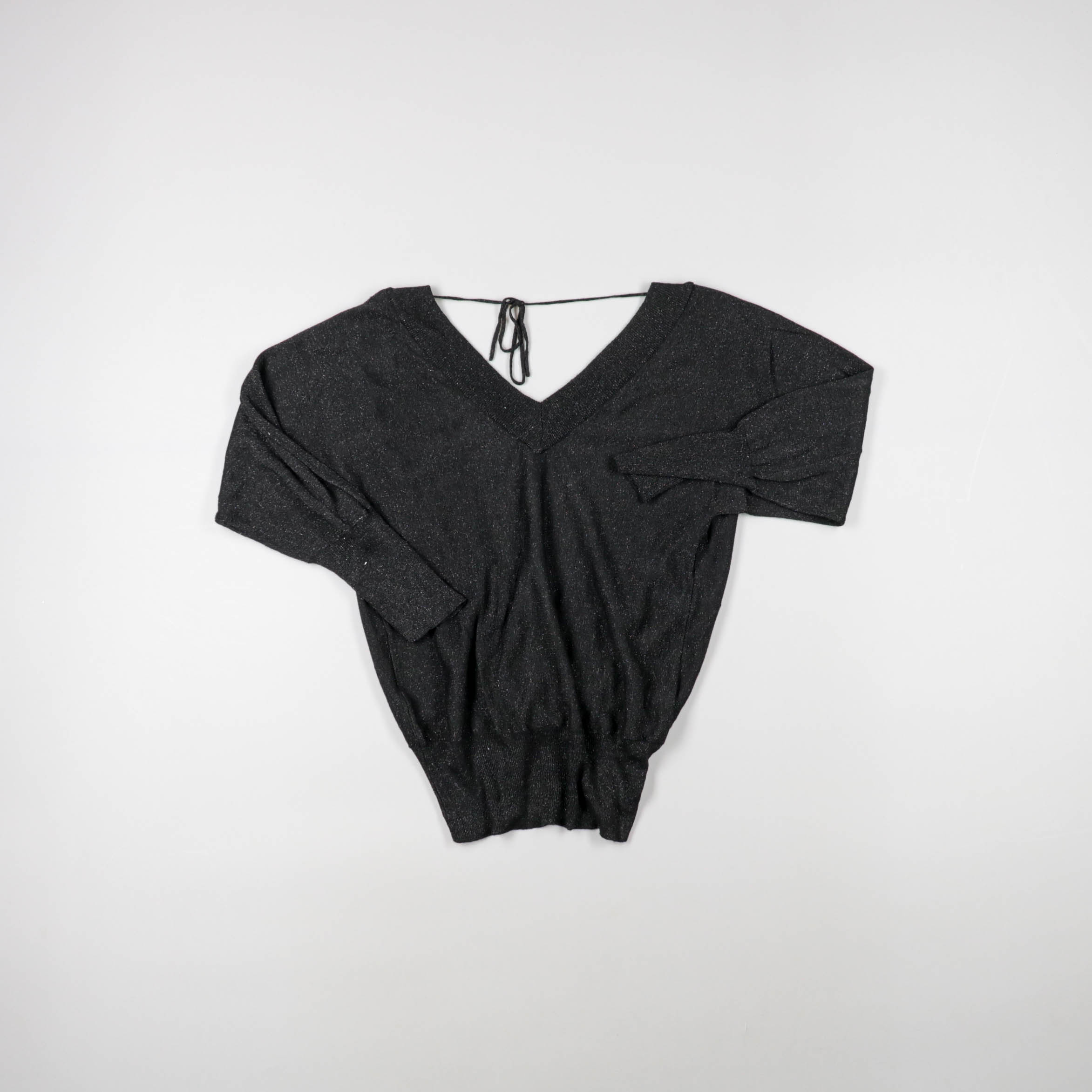 Женский лонгслив с V-образным вырезом и завязками на спине, с эффектом лёгкого люрекса в ткани. Подойдёт для вечерних выходов и повседневных образов с джинсами или юбкой. Практичный плюс — эластичный материал хорошо садится по фигуре и не сковывает дви...