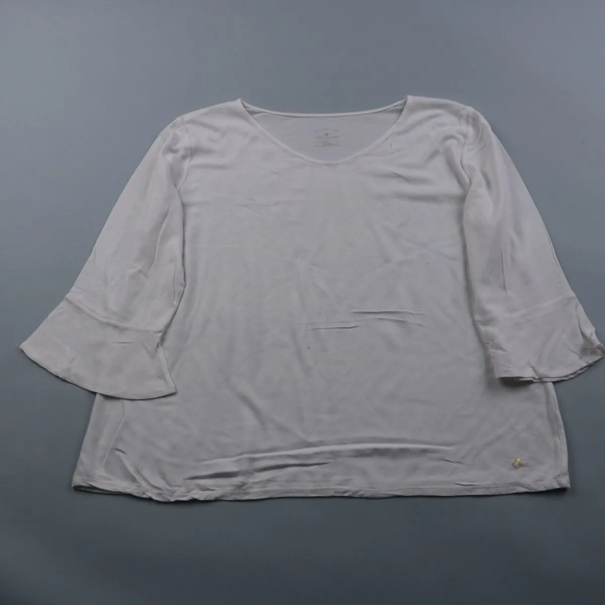 Женский лонгслив Tom Tailor белого цвета с V-образным вырезом и рукавами 3/4 с лёгким расклёшем. Подойдёт для повседневных образов и как базовый слой на работу или прогулки. Мягкий трикотаж комфортно сидит и легко сочетается с джинсами и юбками.
