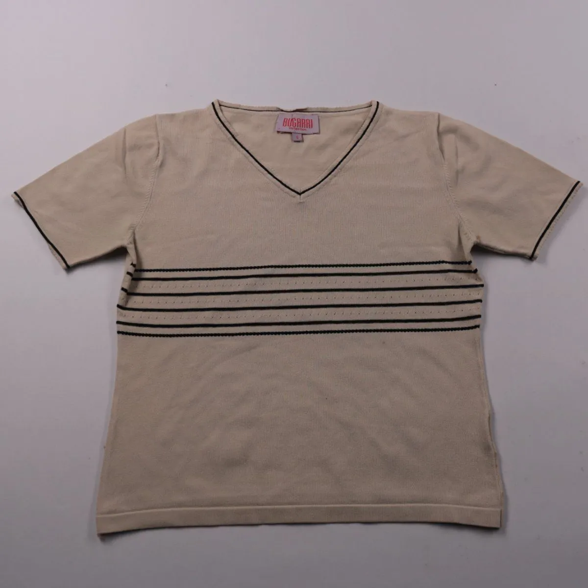 Женская футболка Bugarri бежевого цвета с V-образным вырезом и декоративными горизонтальными полосами. Подойдёт для повседневной носки и офисных образов в тёплое время или как слой под жакет. Трикотаж на основе вискозы мягко ощущается на коже и почти не мнётся.