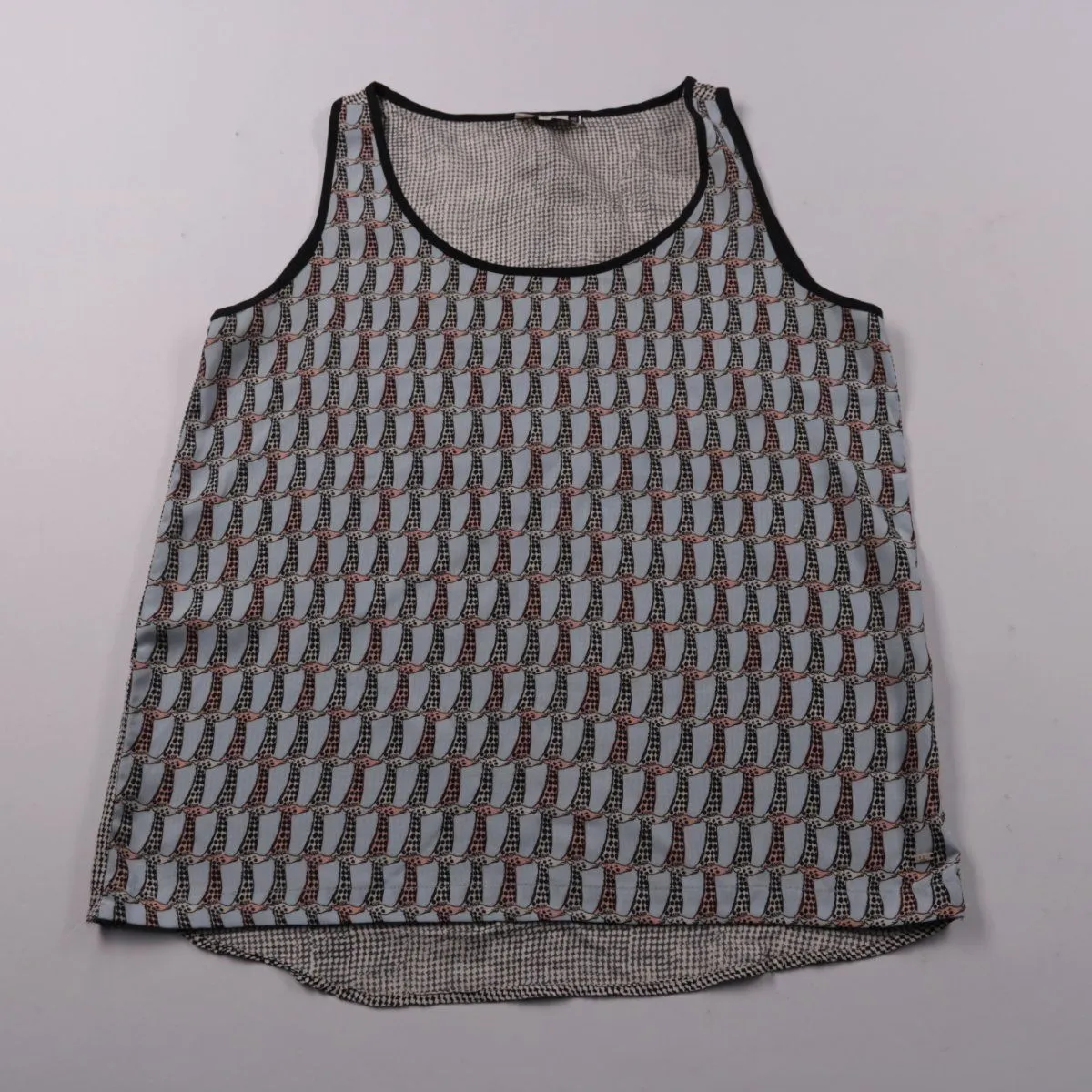 Женская майка CKS с геометрическим принтом и контрастной чёрной окантовкой по горловине и проймам. Подойдёт для лета и многослойных образов с джинсами или юбкой. Лёгкая ткань и свободный крой обеспечивают комфорт в течение дня.