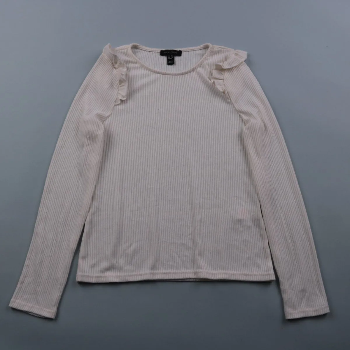 Женский лонгслив New Look молочно-бежевого оттенка в рубчик, с декоративными рюшами по линии плеч. Подойдёт для повседневных образов и офиса, хорошо смотрится под жакет или жилет. Эластичная ткань тянется и не сковывает движения.