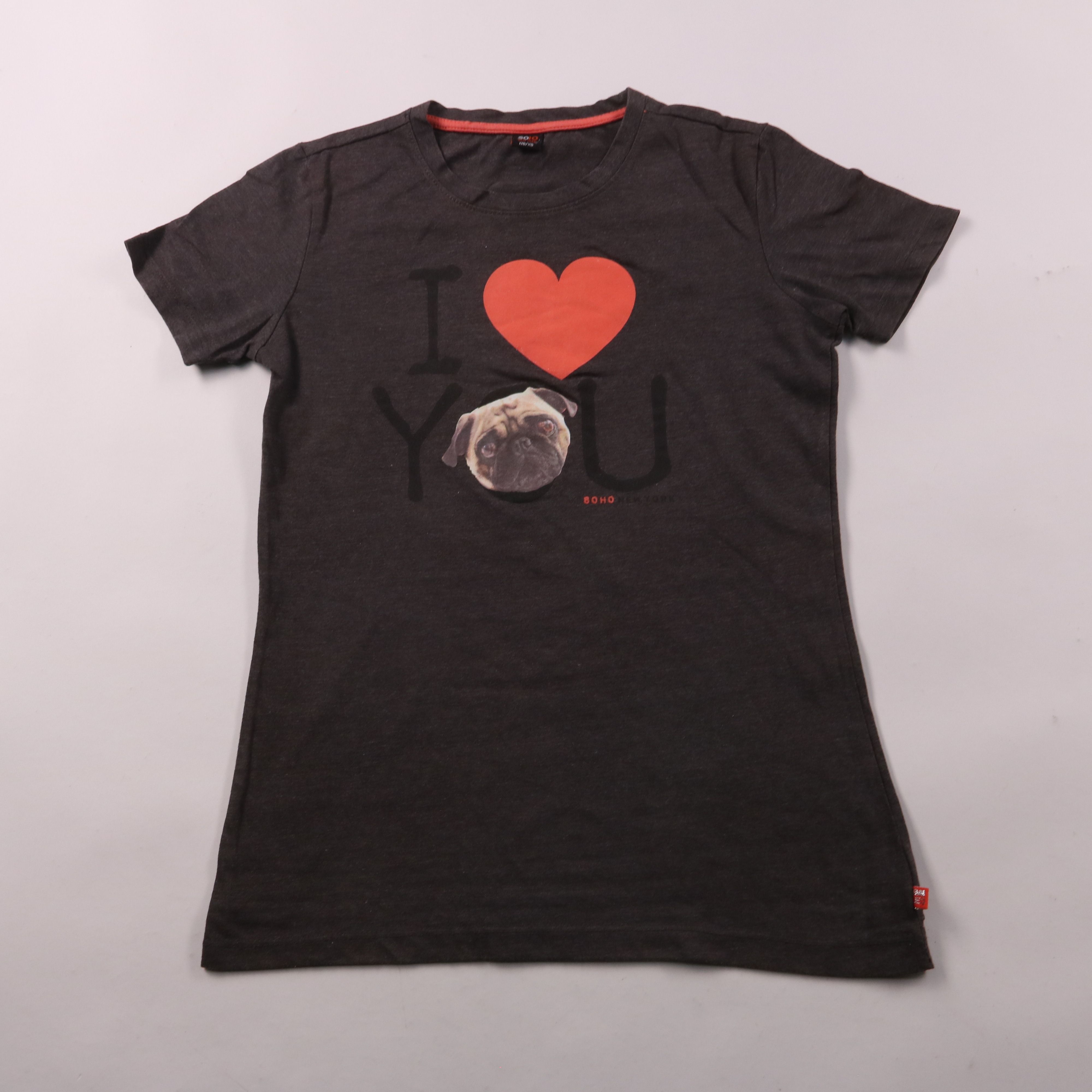 Женская футболка SOHO с коротким рукавом и принтом «I ♥ you» с мопсом на груди. Подойдёт для повседневной носки и летних образов с джинсами или шортами. Практичный плюс — смесовая ткань (хлопок с полиэстером) легче в уходе и меньше мнётся.