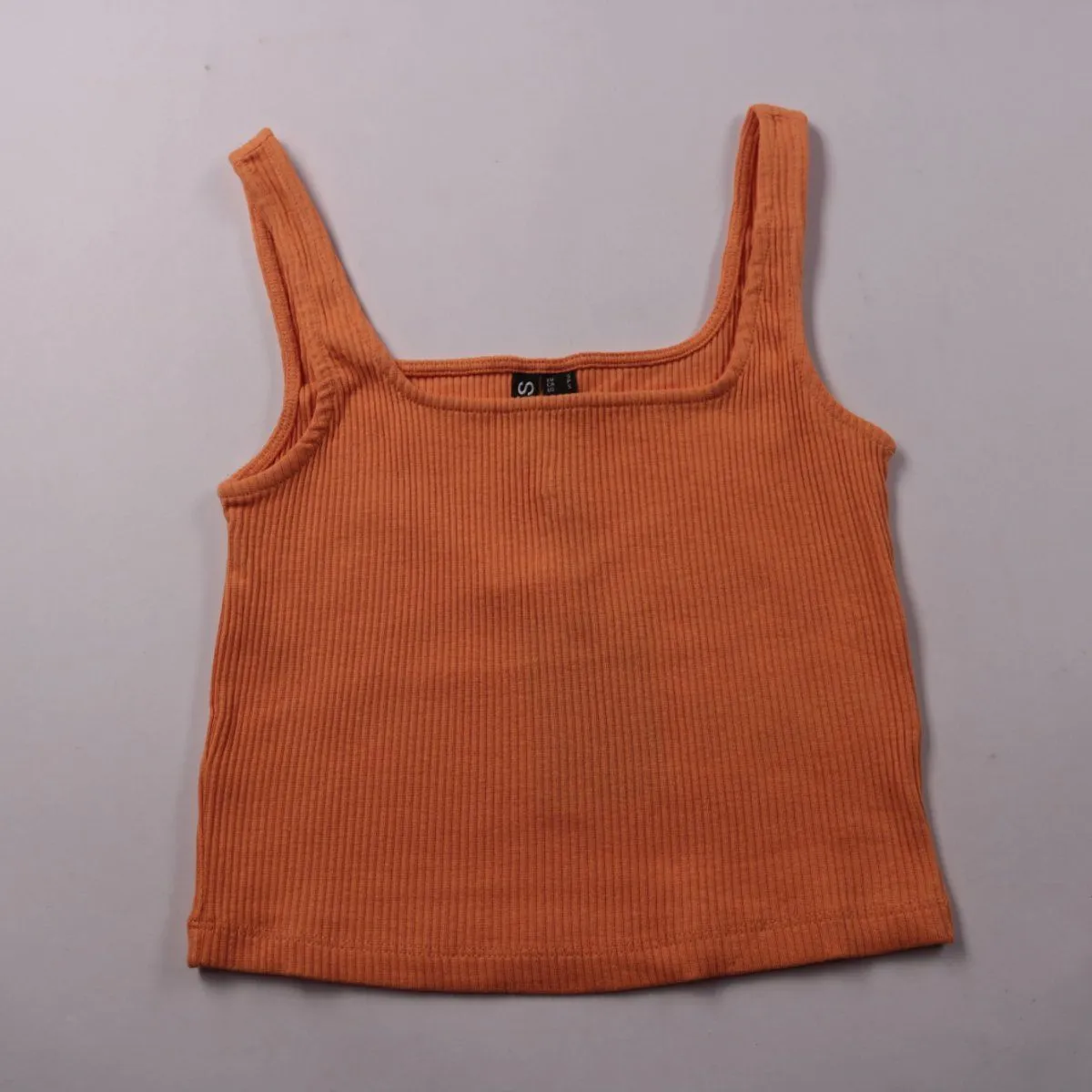 Кроп-майка Pieces в рубчик, цвет tangerine (оранжевый). Подойдёт для лета и тёплых помещений, легко сочетается с джинсами и юбками. Эластичный хлопковый трикотаж хорошо тянется и комфортно сидит по фигуре.
