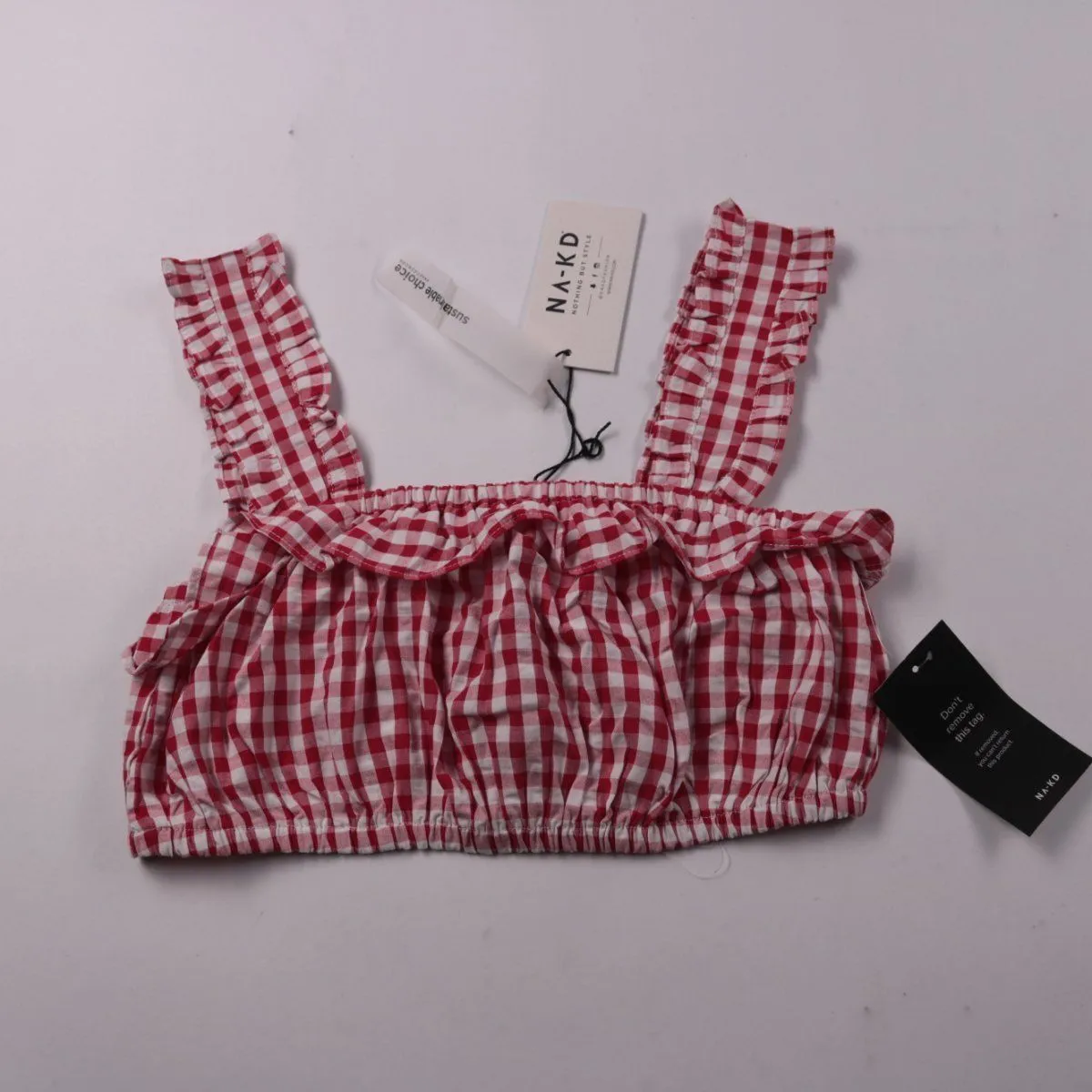 Топ NA-KD в красно-белую клетку с оборками на бретелях и эластичной сборкой по верху и низу. Подойдёт для летних образов с джинсами, шортами или юбкой. За счёт резинки хорошо садится по фигуре и комфортен в носке.