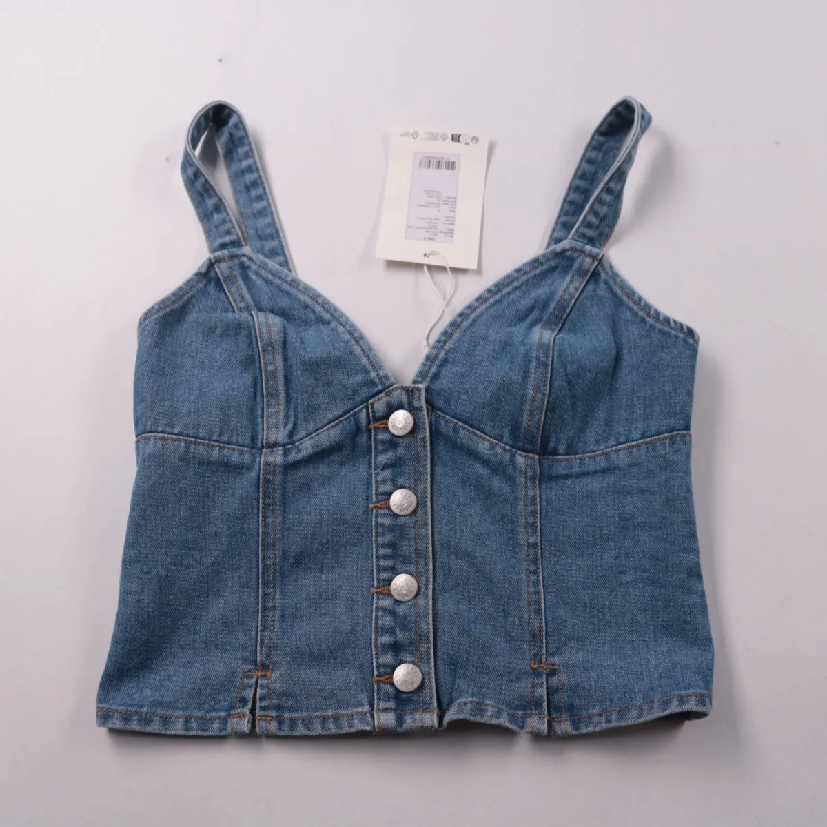 Джинсовый топ-бюстье ONLY на широких бретелях с застёжкой на пуговицы спереди. Сзади есть эластичная сборка, поэтому посадка лучше подстраивается по фигуре; подойдёт для летних образов с джинсами, юбкой или шортами. Плотный деним хорошо держит форму.