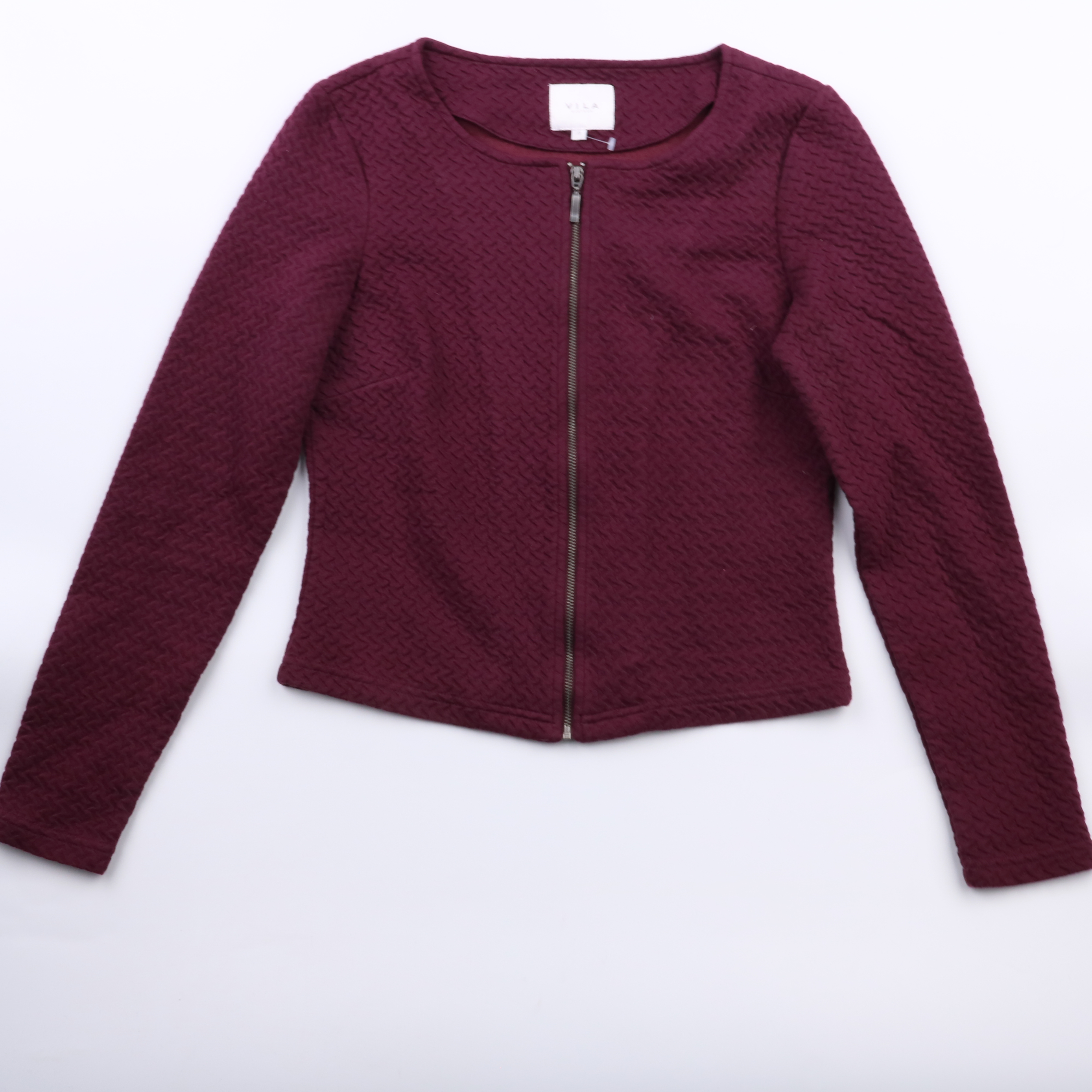 Короткий жакет Vila бордового цвета с фактурной тканью и застёжкой на молнию. Подойдёт для офиса и на каждый день в прохладную погоду, легко сочетается с платьями и брюками. Практичен тем, что не мнётся и прост в уходе за счёт полиэстера в составе.