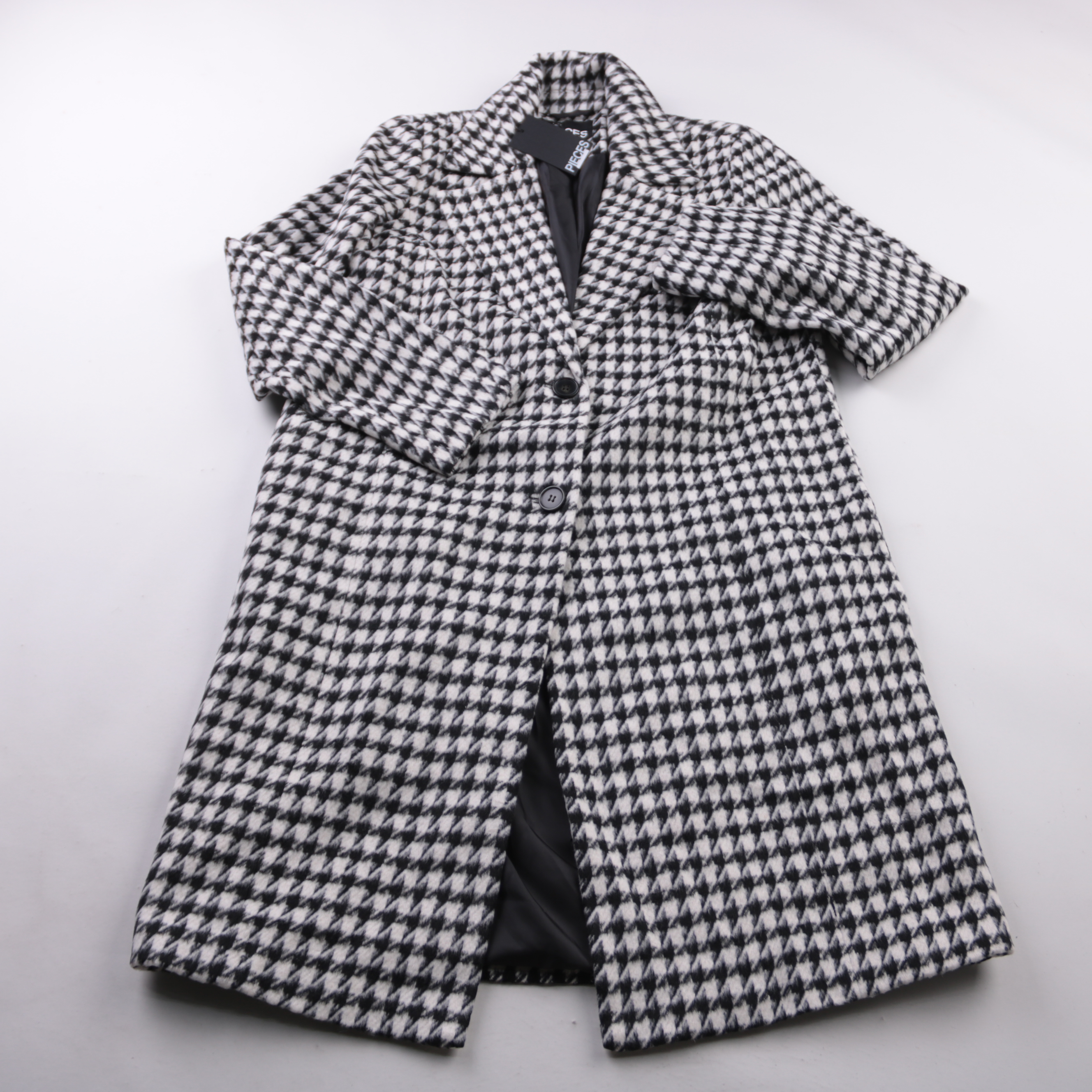 Куртка Pieces в чёрно-белую «гусиную лапку» с классическим воротником и застёжкой на пуговицы. Подойдёт для демисезона и прохладных дней, легко сочетается с джинсами и платьями. Практичный плюс — немаркий рисунок и простой уход за полиэстером.