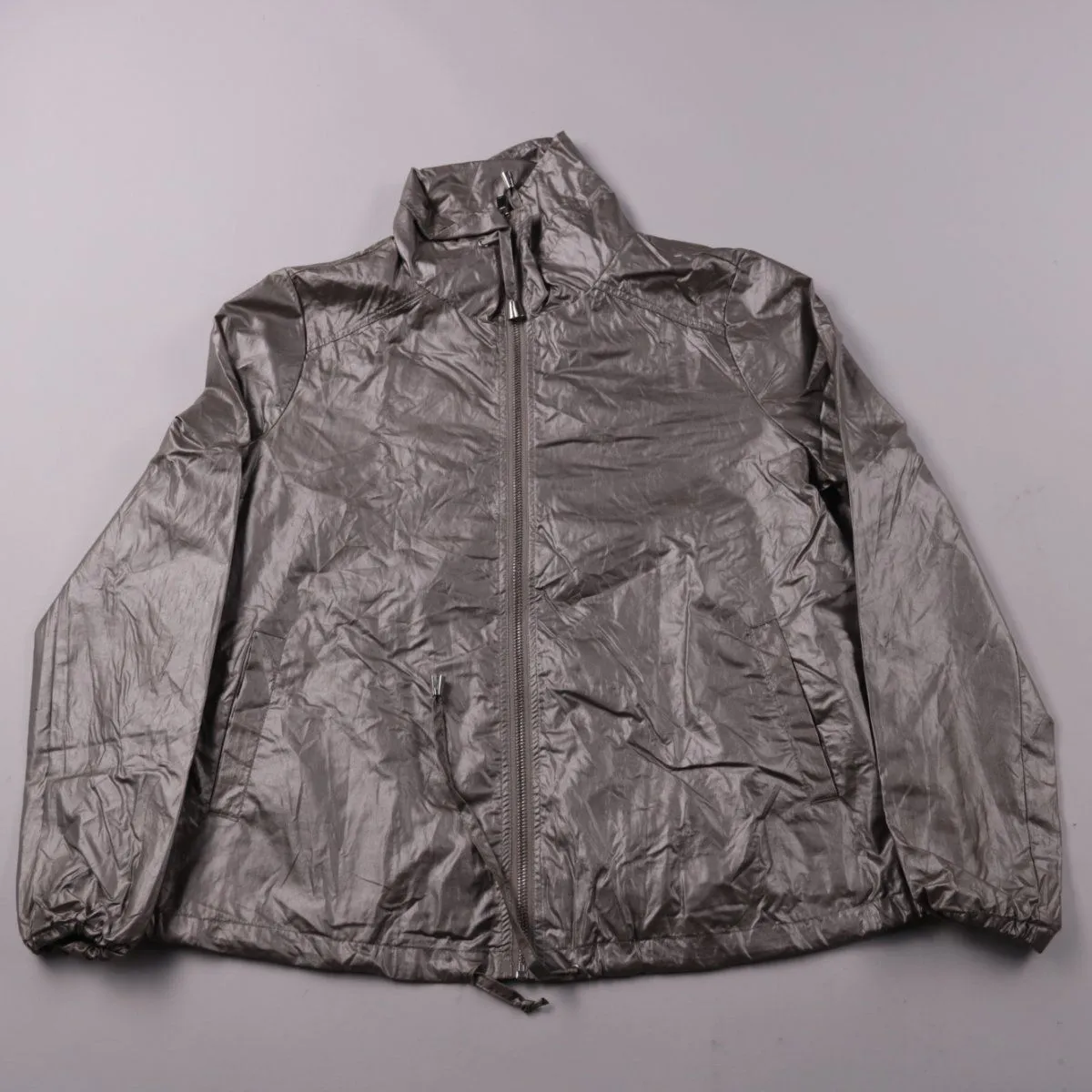 Женская лёгкая ветровка New Look серебристого цвета с застёжкой на молнию и воротником-стойкой. Подойдёт для прогулок и повседневной носки в тёплую весну/осень. Тонкий материал легко складывается и не занимает много места.