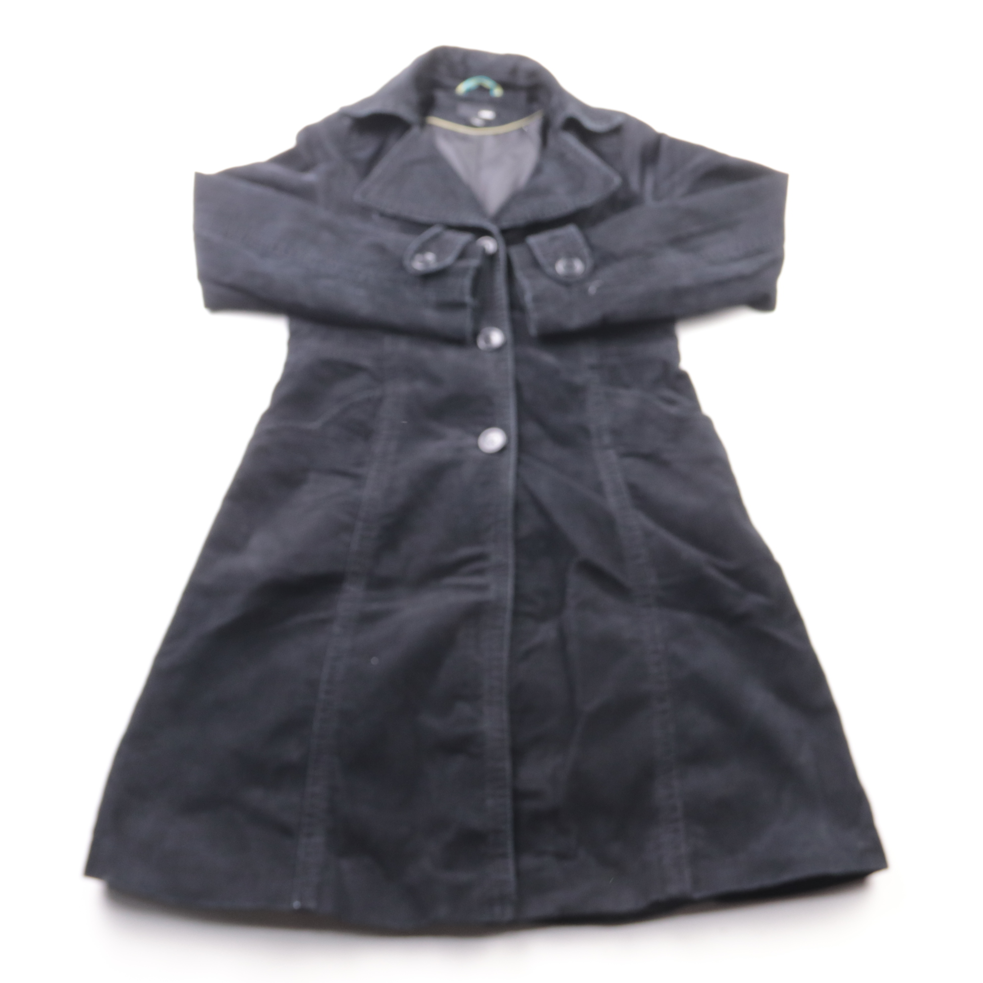 Женское вельветовое пальто H&M в чёрном цвете на пуговицах, приталенный силуэт. Подойдёт для повседневных образов в межсезонье и на прохладную погоду. Практичное: плотная ткань и подкладка помогают держать форму и сохранять тепло.