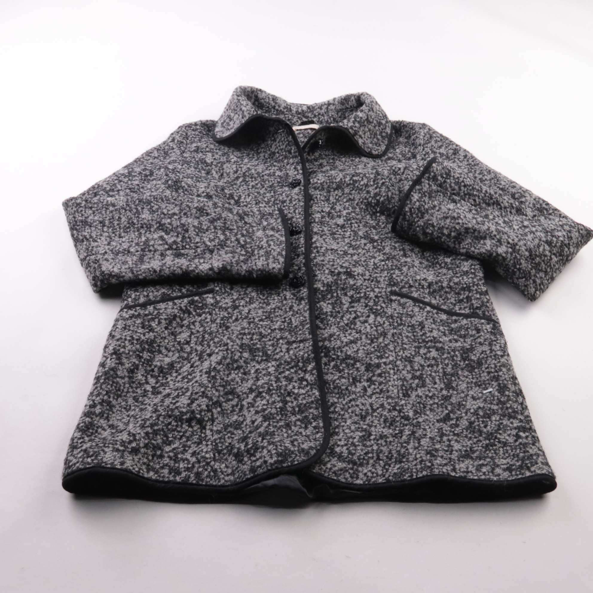 Пальто Daxon из фактурной буклированной ткани серо-чёрного меланжа с контрастной окантовкой и застёжкой на пуговицы. Подойдёт для прохладной погоды и офисных/повседневных образов, хорошо сочетается с базовыми вещами. Практичное за счёт плотного материа...