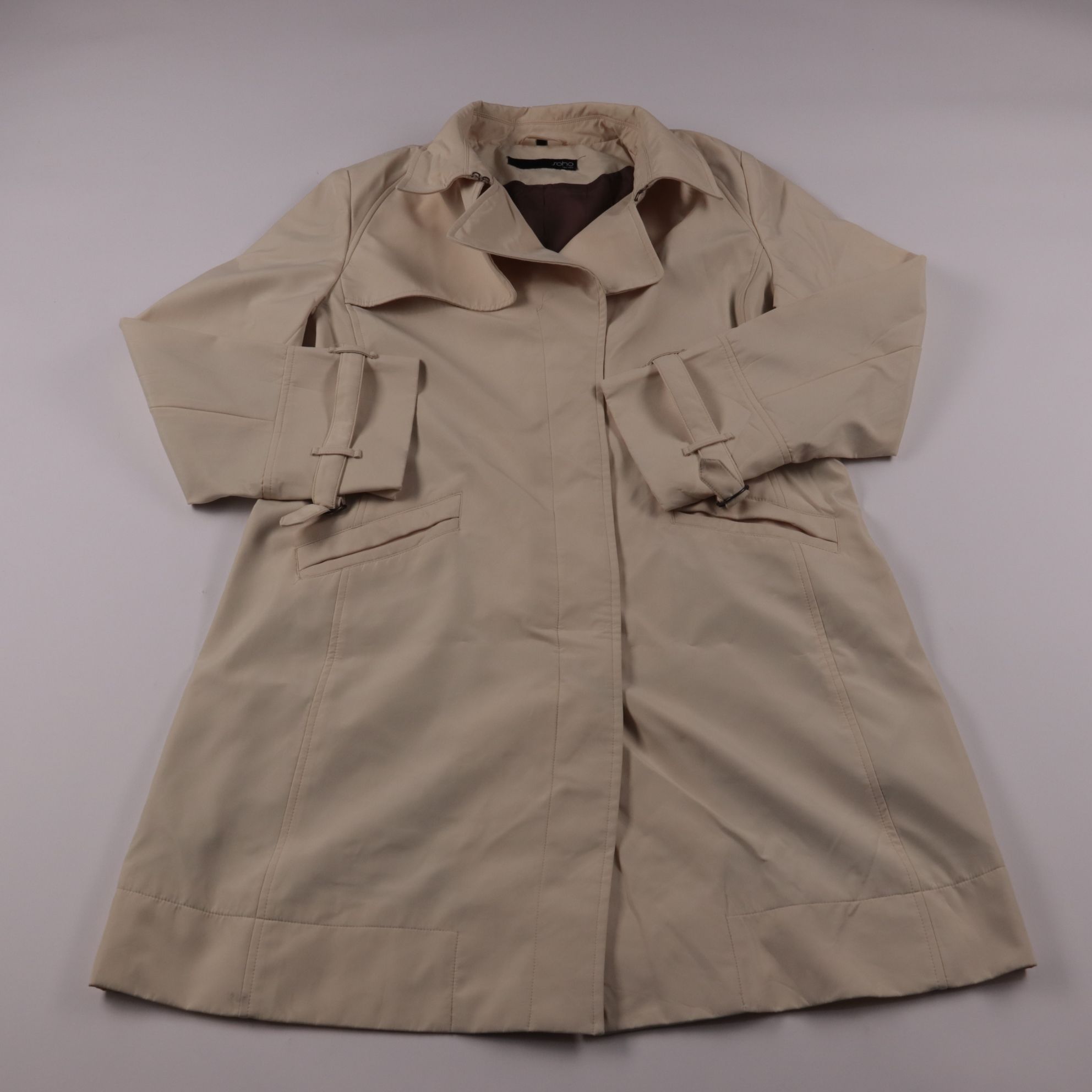 Женский плащ SoHo в бежевом цвете, прямого кроя с отложным воротником и поясом на манжетах. Подойдёт для весны и осени, хорошо смотрится с джинсами и платьями в повседневных образах. Практичные карманы и гладкая ткань делают его удобным для города и по...