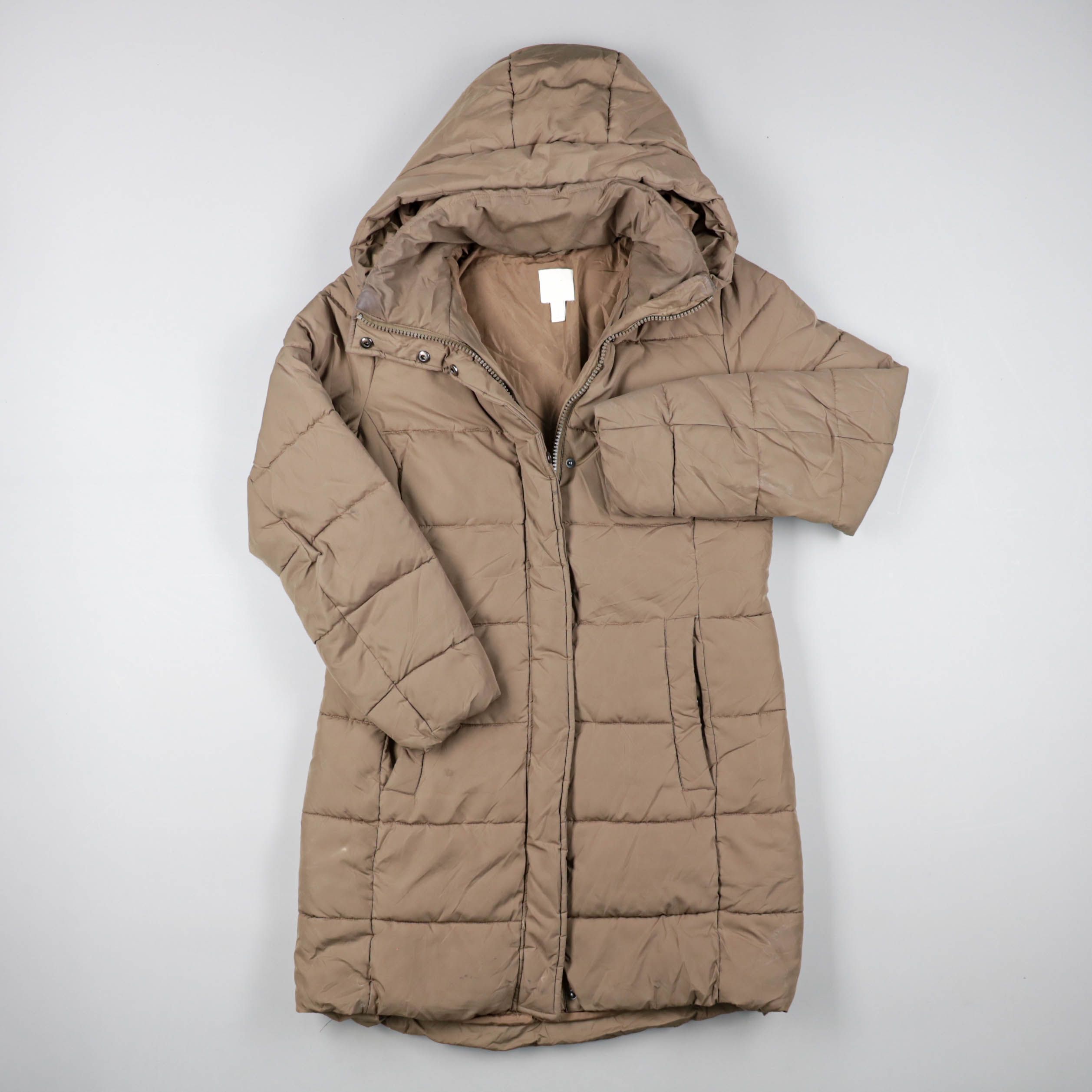 Женский пуховик с капюшоном в бежевом цвете, длина чуть ниже колена, стёганый силуэт. Подойдёт для зимних прогулок и поездок по городу, хорошо сочетается с повседневными образами. Удобная застёжка на молнию и тёплый объёмный крой помогают сохранять теп...