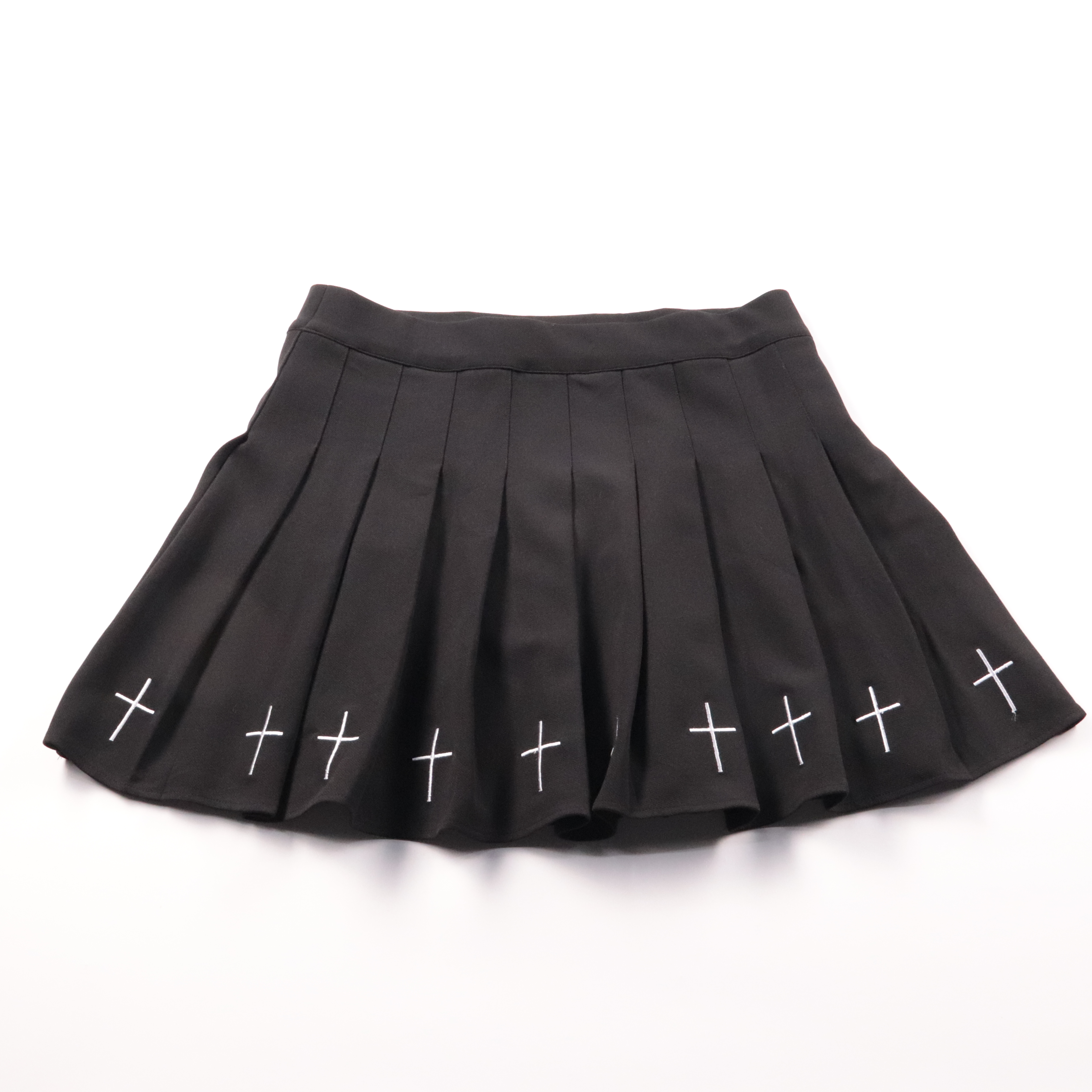 Чёрная плиссированная юбка из эластичной ткани с белой вышивкой в виде крестиков по низу. Подойдёт для повседневных образов и для стилизации в альтернативном/гранж стиле. Материал почти не мнётся и хорошо тянется, поэтому её комфортно носить весь день.