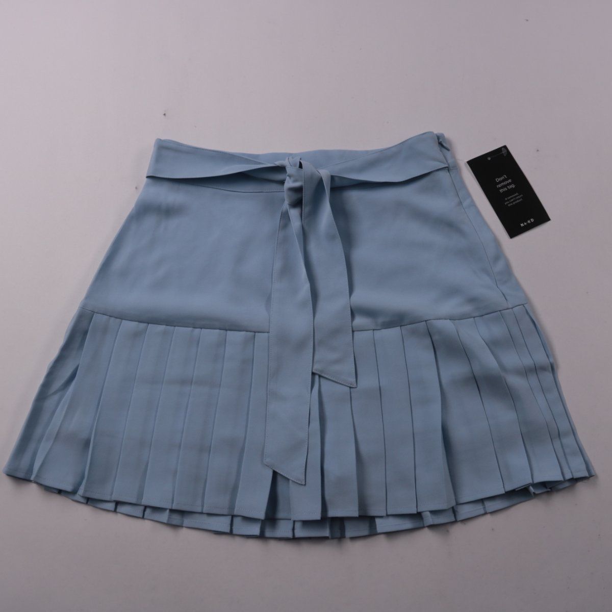 Короткая женская юбка NA-KD в голубом цвете с плиссированной нижней частью и поясом-завязкой. Подойдёт для летних прогулок и повседневных образов с топами и рубашками. Лёгкая ткань и подкладка делают посадку более комфортной.